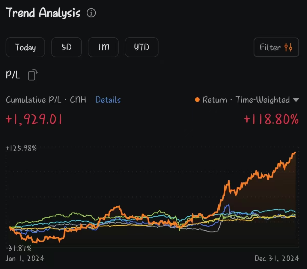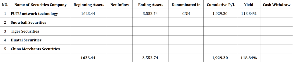 2024年度投资总结作者: thomas / 2024-01-27 Views: 83 经过了2022年对投资资金的大量回撤后,仅保留了少量资金,所以2024年全年没有登录过股票账号。从股票账号情况来看,2024年的收益率超过了100%,主要得益于小米股票的大幅上涨,但是由于持仓资金有限,实际的收益率并不是很多。