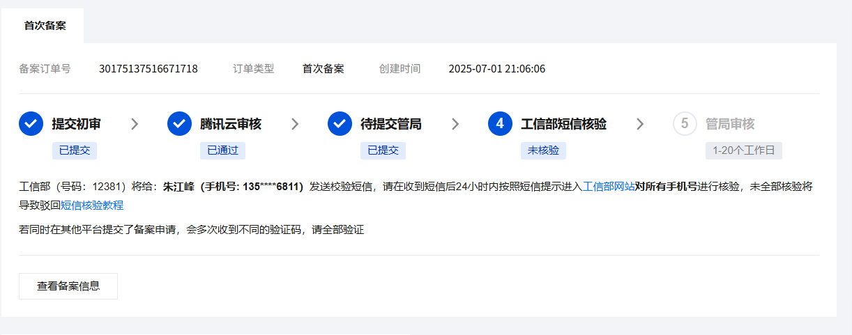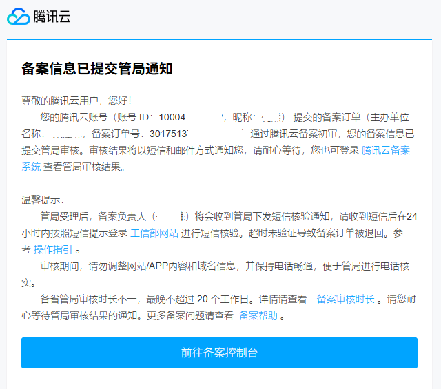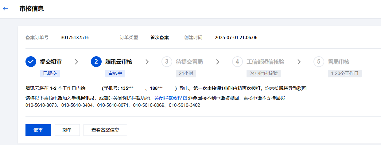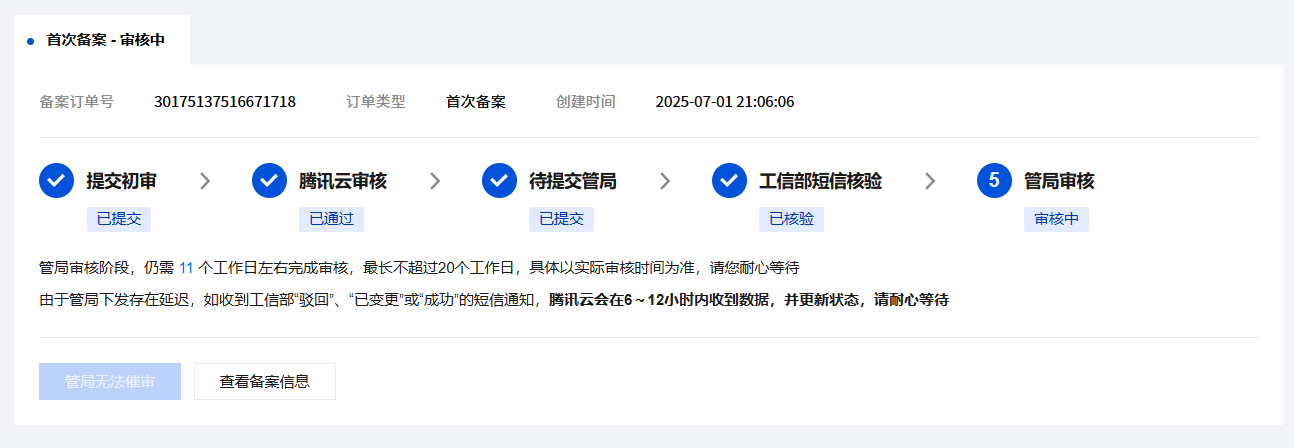 提交完备案信息后,腾讯会进行初审,然后提交给管局。