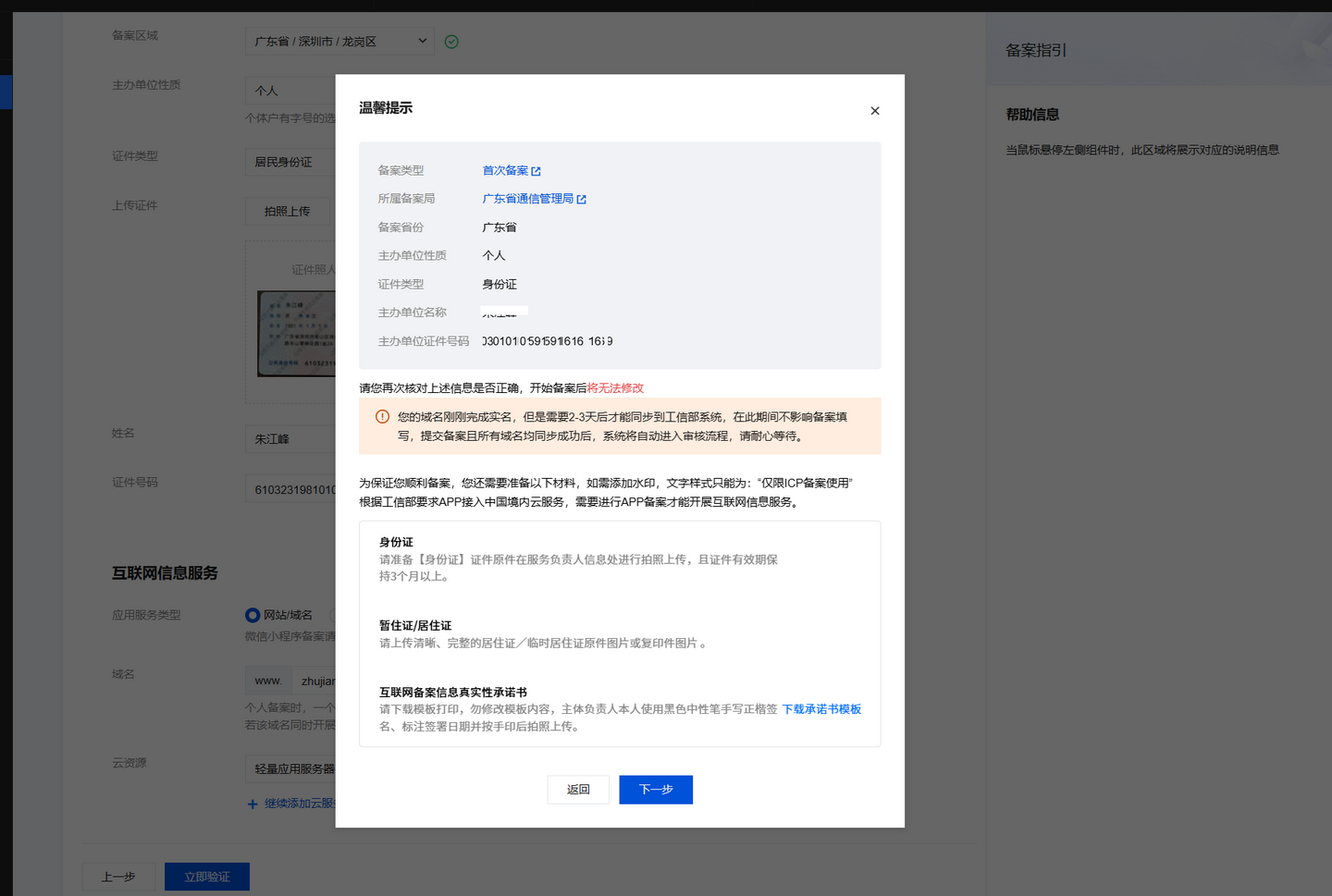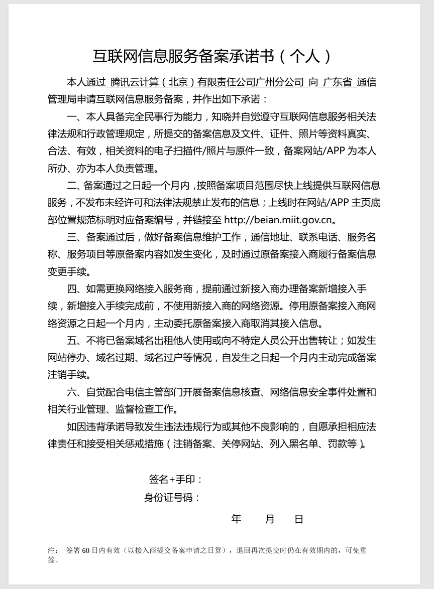 3. 个人备案需提供 广东省个人互联网信息服务备案承诺书,主体负责人本人需手写身份证号码+日期 + 签名(接受签名章,不接受连笔签)+ 按手印。