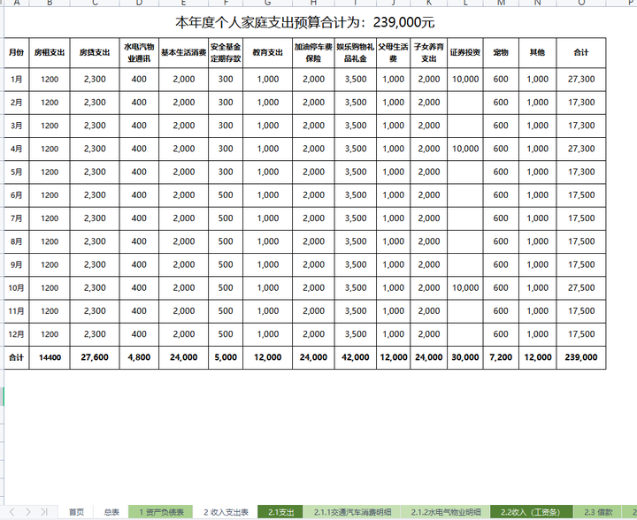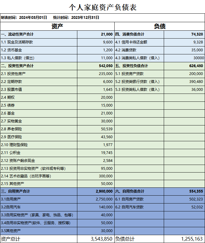 使用“资产负债表”做好家庭资产盘点,我们一般是一年绘制一次,把家庭内的资产和负债列清楚,看看自己的资产净值是多少。