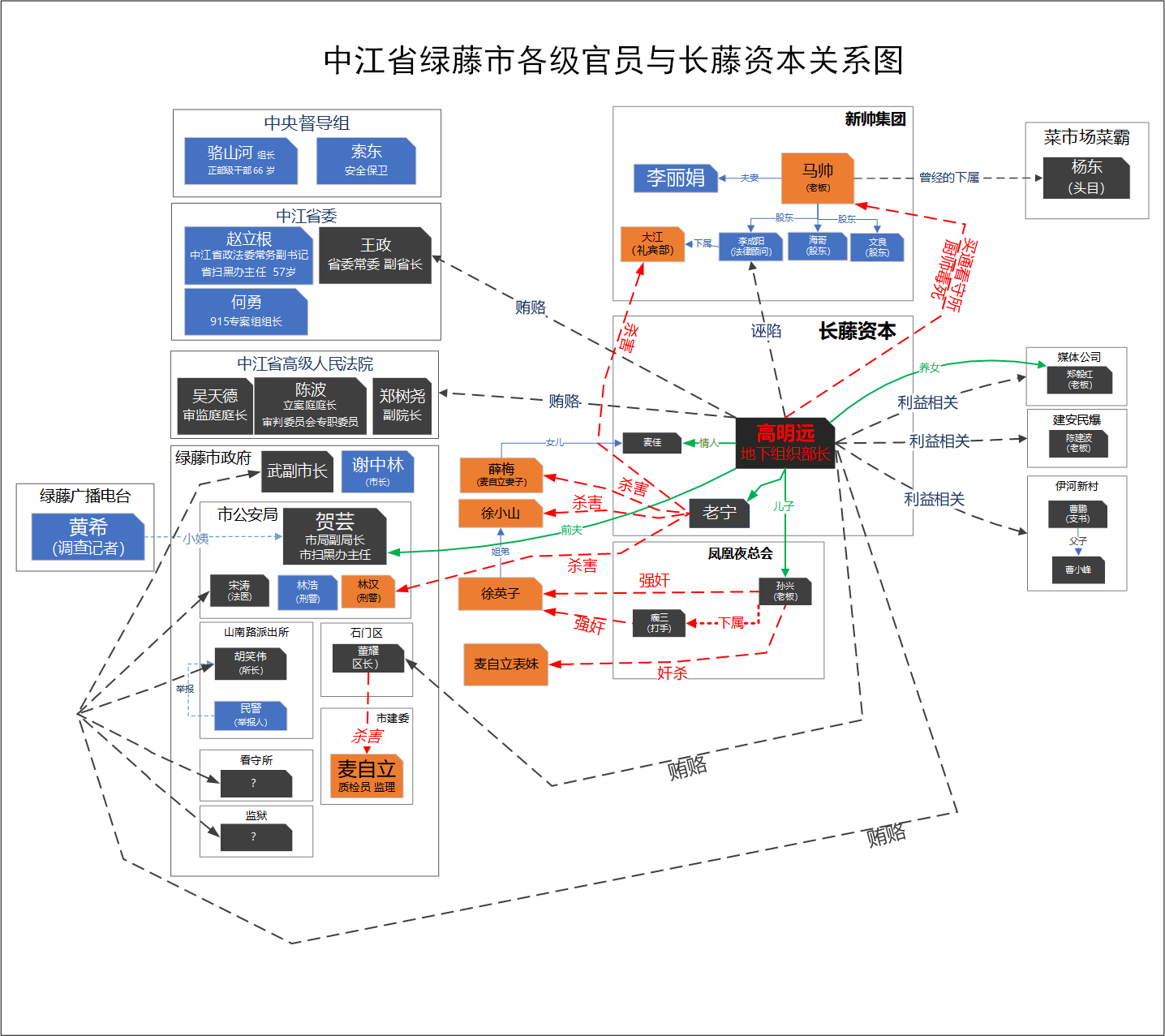 下图中黑色部分就是庞大的官僚垄断组织在绿藤市的政商届的渗透和把持。