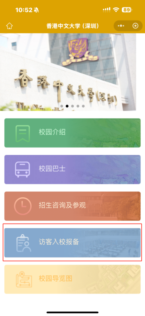 1、请您务必提前在微信小程序“参观港中深”进行报备,凭报备审批截图入校(在读学生刷学生卡入校)。