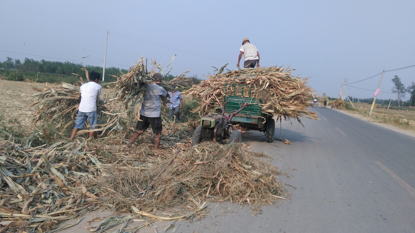 玉米杆装车是一个需要技术的活,讲究的是 压瓷、摆平、左右前后配重平衡,否则没走出几部就翻车了。