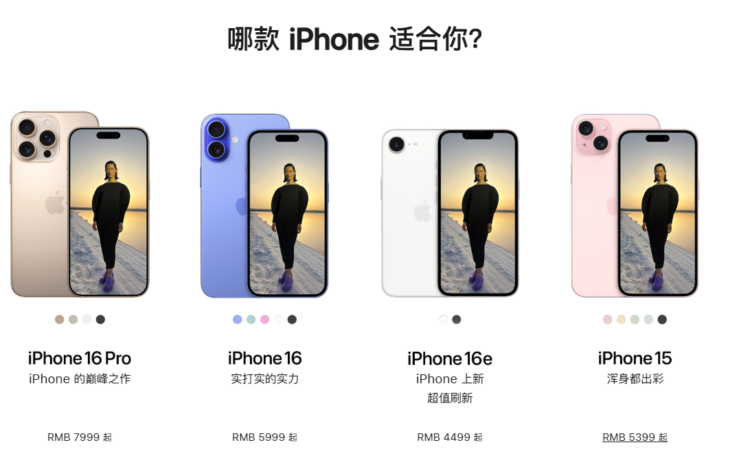| iPhone 16e | 6.1英寸 OLED | 最便宜A18机型(3999元) | 单摄、阉割GPU、无灵动岛 | 3999元 | 预算极严/备用机用户 |