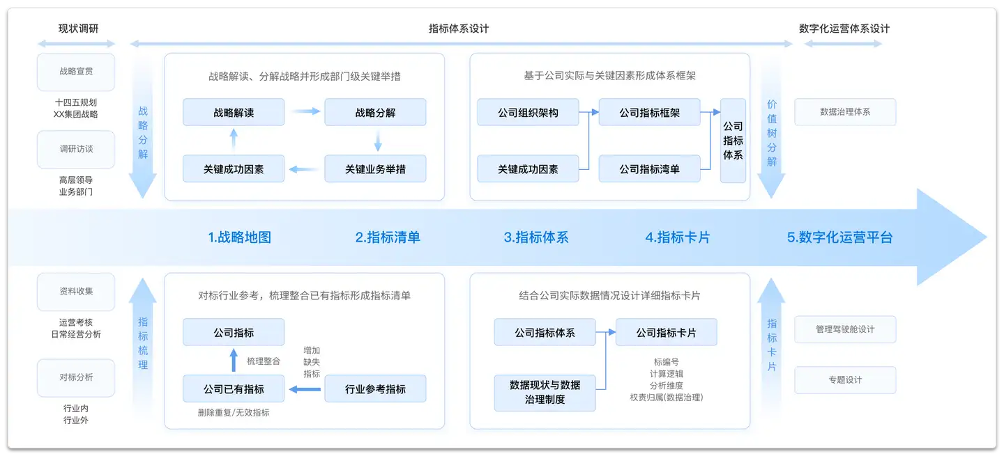 从企业经营战略出发,分解关键业务动作,形成公司级指标体系,在对标行业业务经验, 最终形成指标卡片,指导数据报表和分析